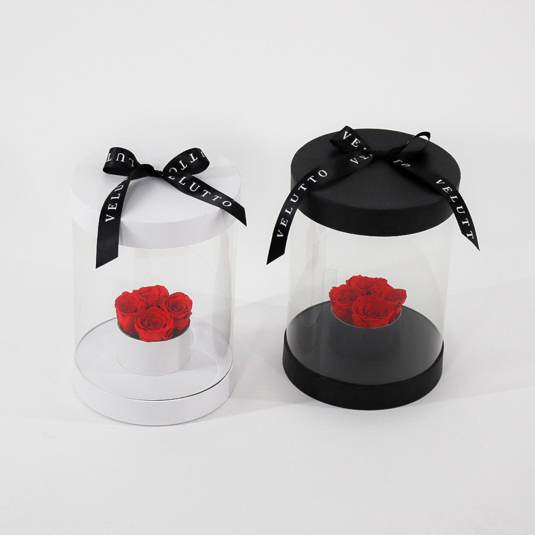 Discover Velutto real roses that last for years, arranged in our designer arrangement "4 Ever" sitting pretty in a large display box it comes with 4 perfect roses that can last for eternity.